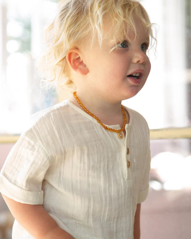 A relaxed fit with dropped shoulders, folded cuffs and a rounded hem. Fastened at the front three wooden buttons, this cute yet practical detail makes dressing easy. Reinforced French seams for extra durability.