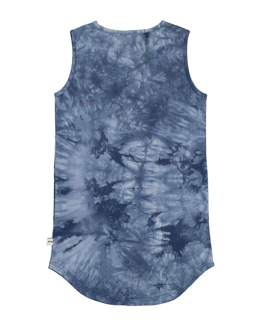 Cotton/spandex tank dress in blue tie-dye with small dove print in white on chest. Easy flattering style with curved hem.