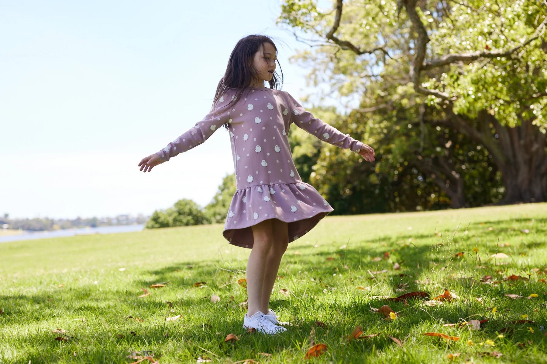 Brushed cotton / spandex dress in mauve with ‘snow fairy bird & snowball’ yardage print. Our easy-wear, easy-style, ever-popular frill dress, don’t miss out on this prettiest shade of mauve & cutest print!