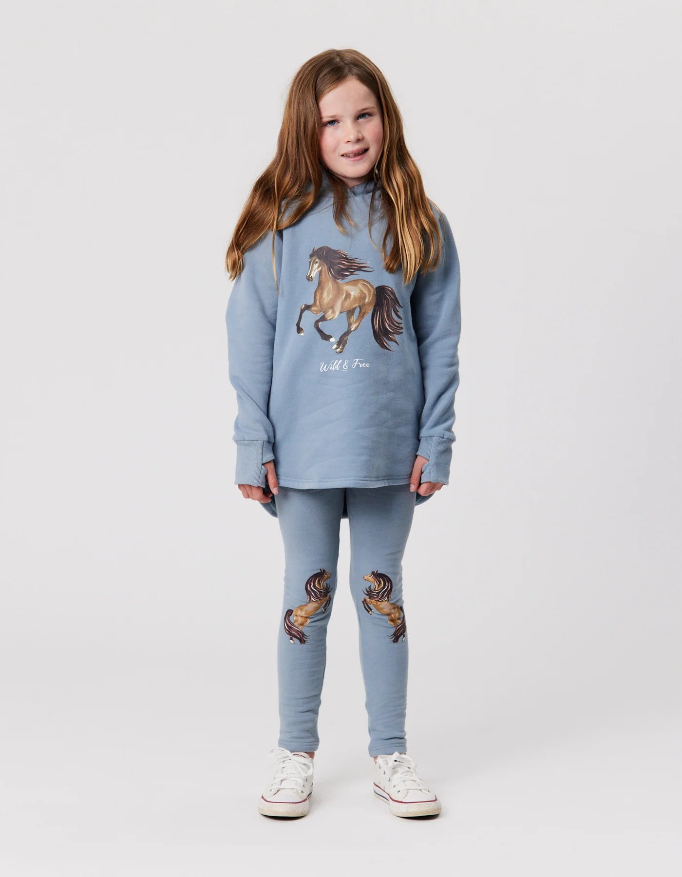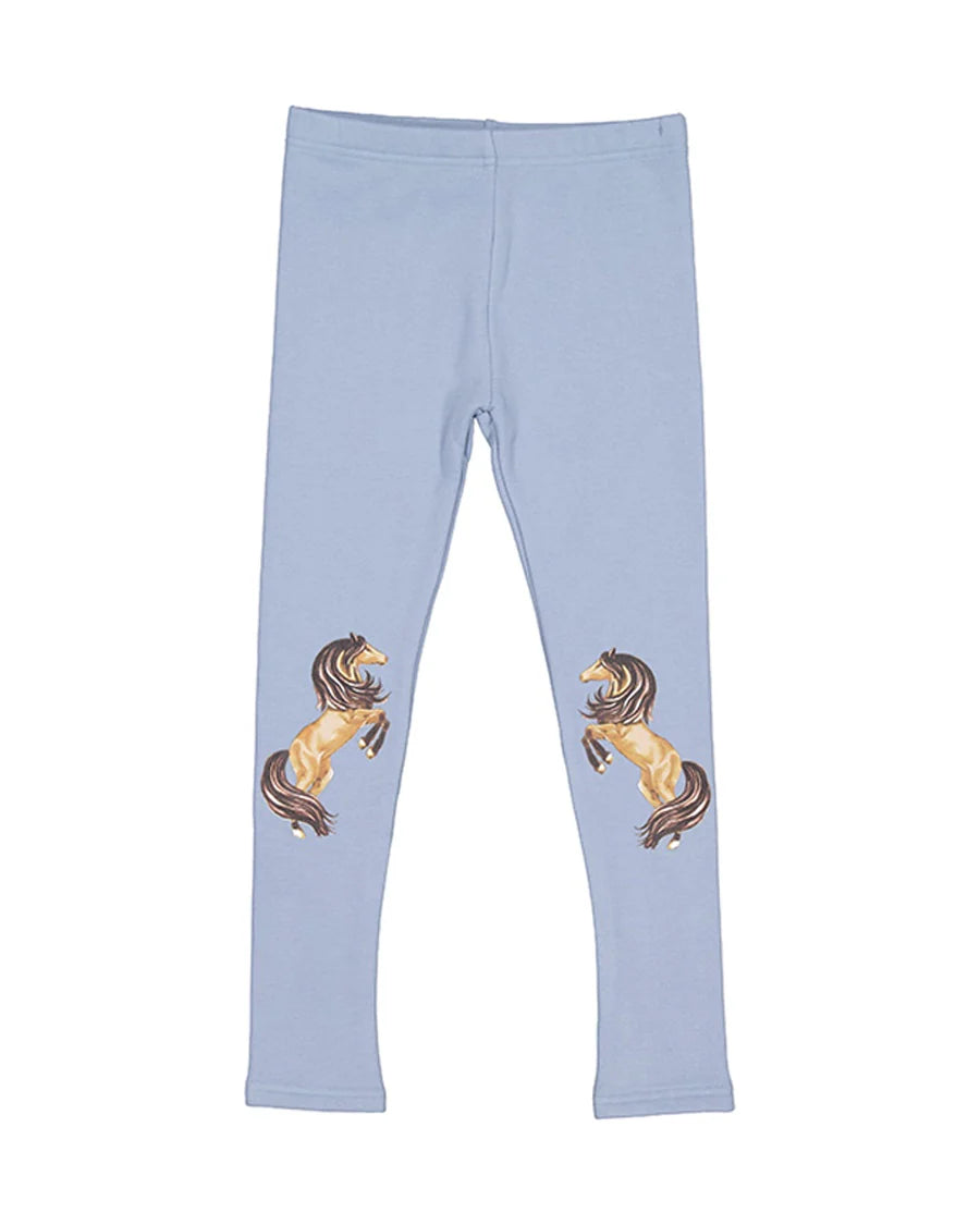 Brushed cotton / spandex legging in slate blue with ‘Rearing Horse’ knee print & signature Kissed by Radicool dove logo on reverse. Your fave cosy leggings guaranteed to keep your mini warm.