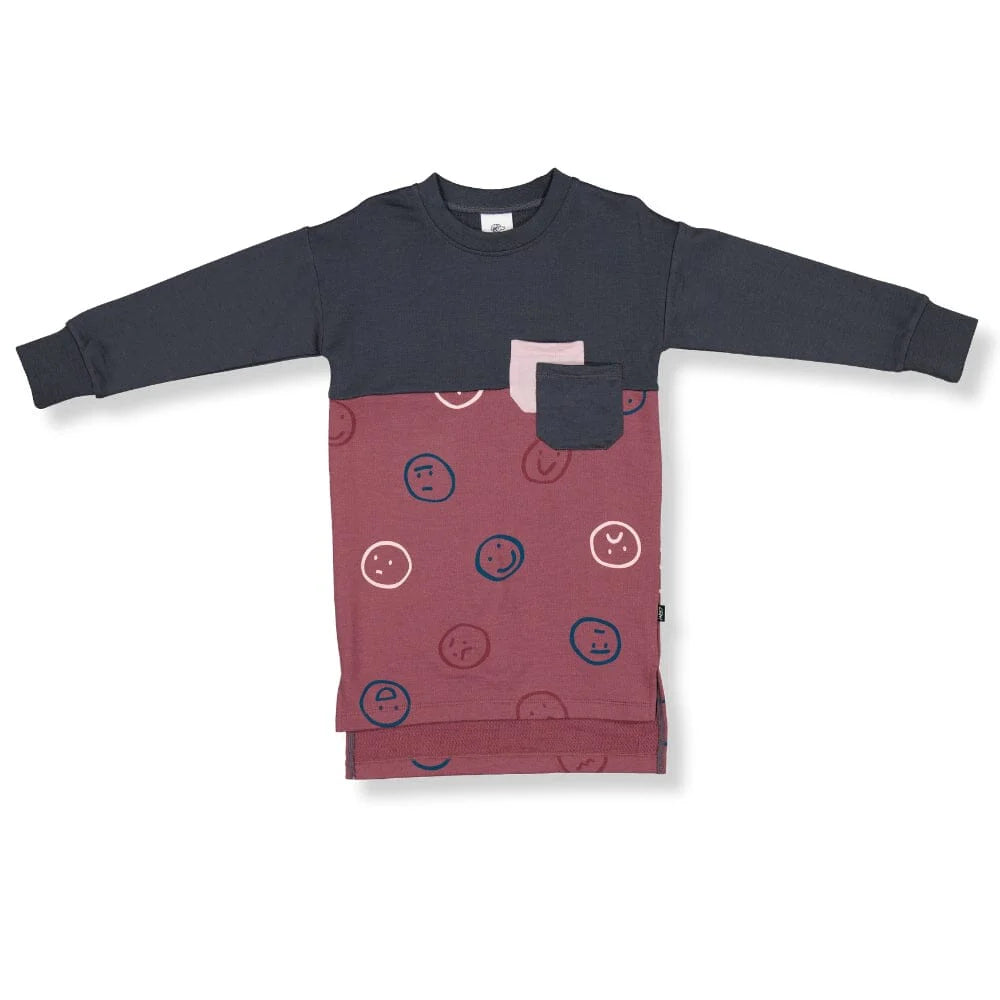 The Mila Sweatshirt Dress is made from heavyweight 100% Merino terry loop sweatshirting and features contrasting solid and printed panels on the front and back, with accented colourblock double pocket and sleeves.