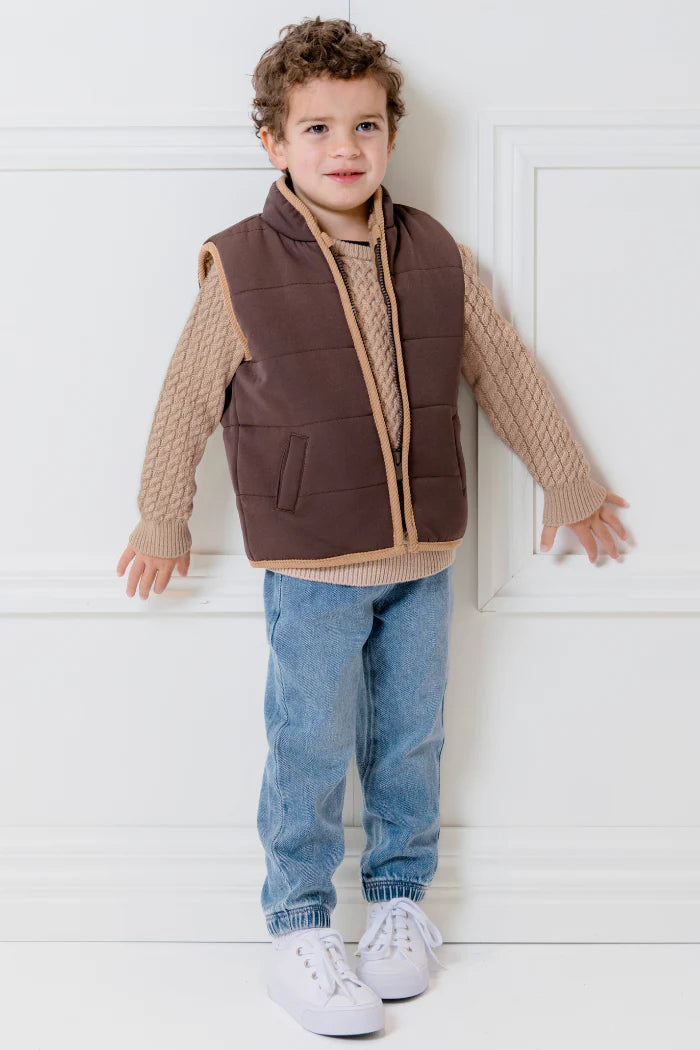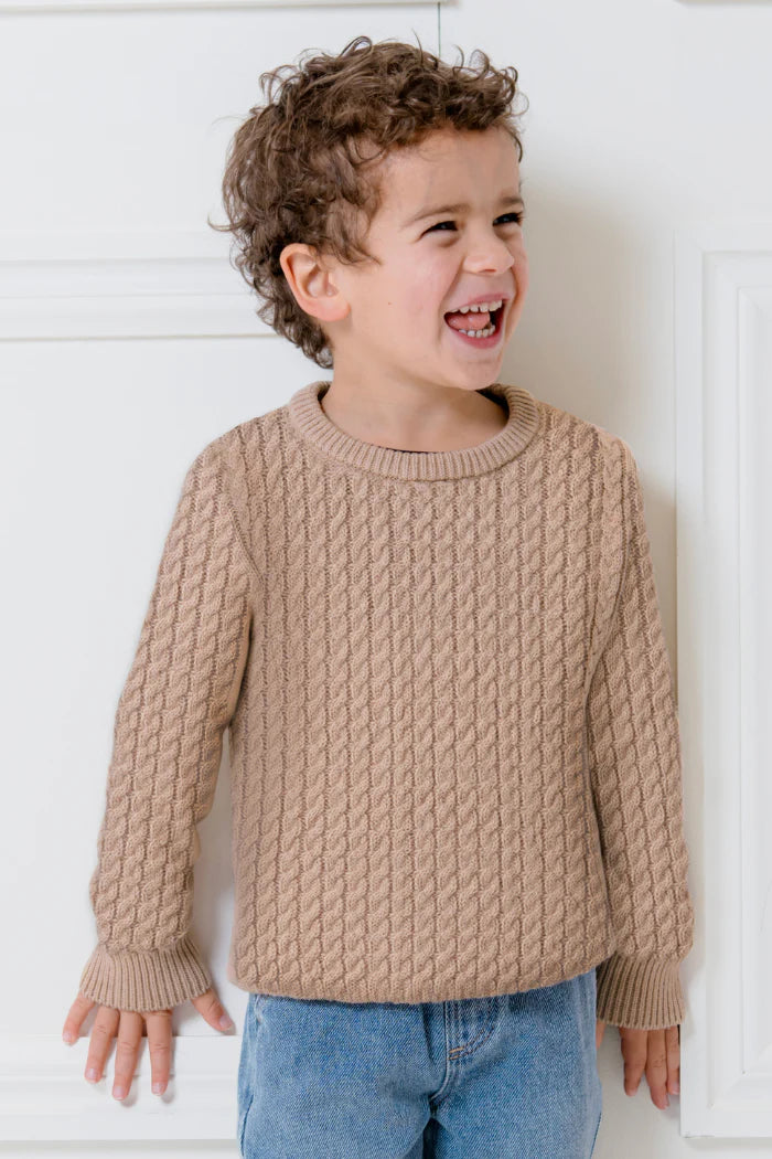 Milky Clothing Mocha Cable Knit Jumper. Keep your little one snug and stylish in this adorable cable knit jumper! Made from a cotton blend, it’s designed to withstand wash after wash while remaining soft and comfortable. Perfect for any occasion, this versatile piece will become their go-to jumper. It easily pairs with track pants or jeans and is available in four delightful colors. Your little one will love wearing it all year round!