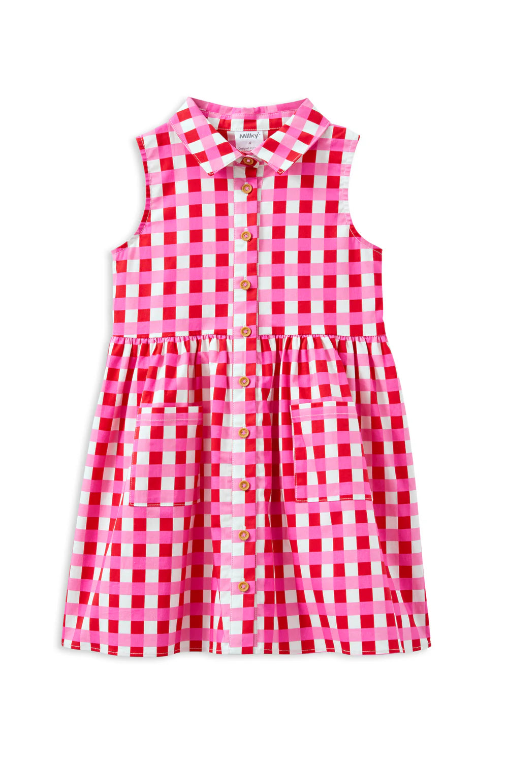 Add a burst of colour to your little ones summer wardrobe with the Milky Clothing Lollipop Check Dress. This sleeveless style features a playful all-over pink and red check print, a functional front button opening, and a gathered waist for a relaxed, twirl worthy fit. Lightweight and breezy, its perfect for warm days filled with play, parties, or park picnics.