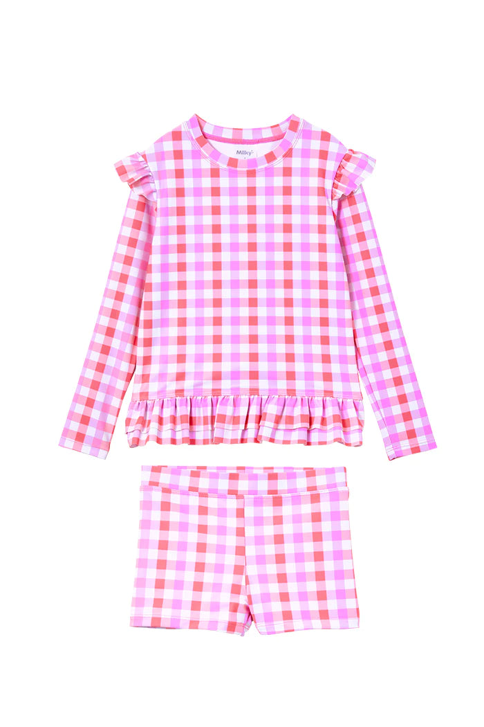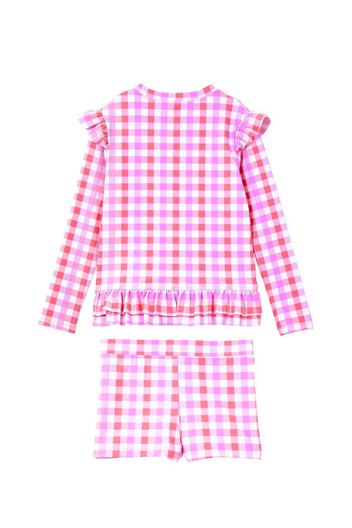 Milky Clothing Neon Gingham Rash Set with UPF rating is the perfect set to be wearing for a day at the pool or beach. This check print in cheerful tones of pink and orange is designed to add a pop of brightness to any summer day. The check print offers a unique combination of style and function that will make you stand out in a crowd. For a complete outfit pair back with the Neon Gingham Swim Hat
