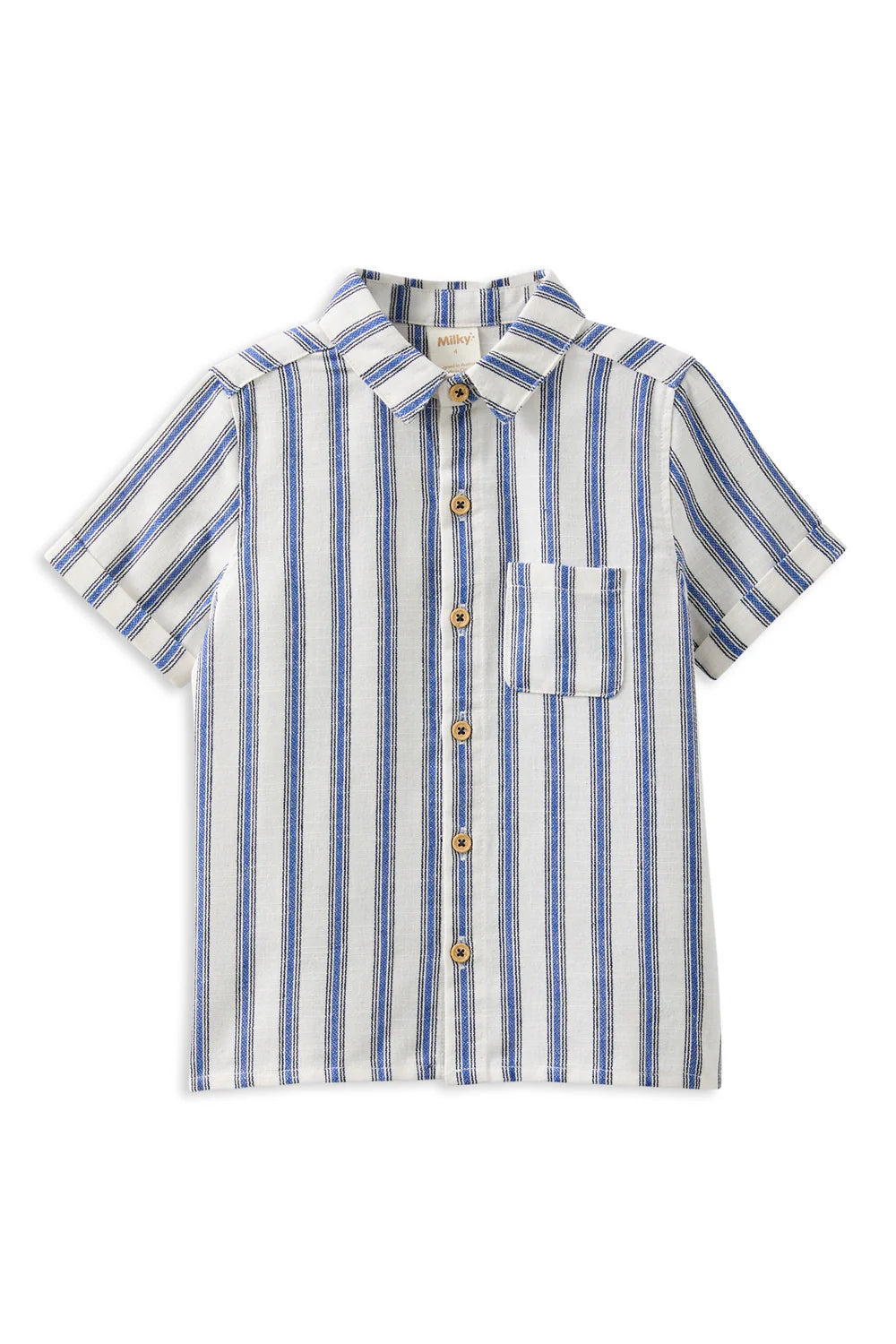 Milky Clothing Stripe Linen Shirt, crafted from a breathable cotton-linen blend fabric, perfect for warm weather adventures. But the standout features don't stop there! This shirt boasts: Wood-look buttons, Self-fabric pocket, Short sleeves, and side splits at hem. This shirt is part of a set with matching bottoms that's very on-trend.