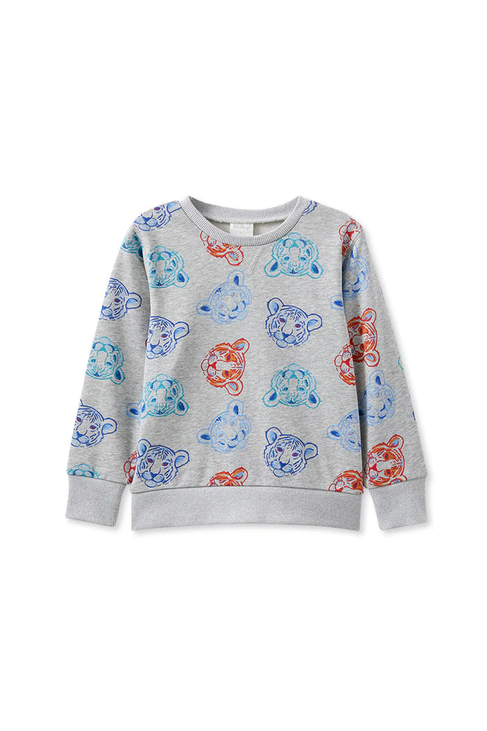 Milky Clothing Tiger Fleece Sweat. Add some excitement to your little boy's winter wardrobe with the Milky Clothing Tiger Fleece Sweat! This soft, unbrushed fleece sweatshirt in silver marle features a vibrant all-over tiger print that’s sure to turn heads. Its trendy design makes it easy to pair with classic jeans or matching track pants, creating a bold and stylish look for any occasion. Perfect for keeping warm while making a statement!