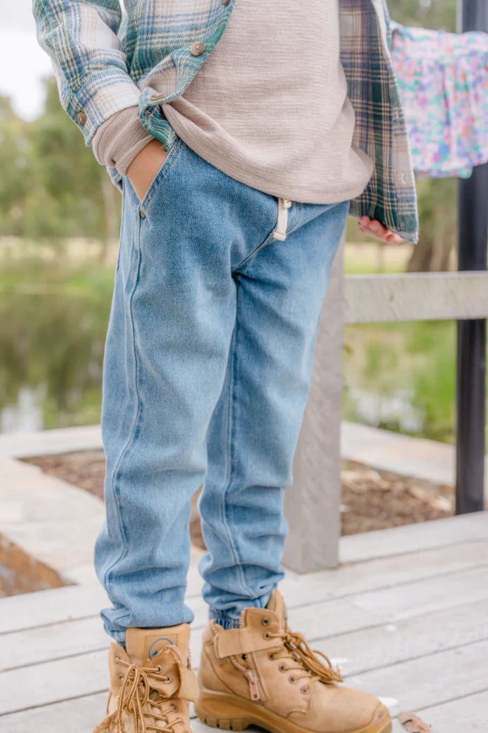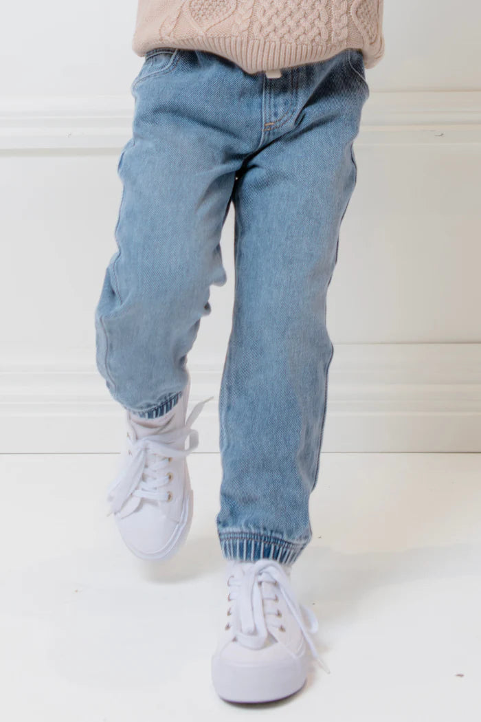Milky Clothing Light Wash Denim Jean. Your little one’s go-to for style and comfort! These hard-wearing yet fuss-free jeans feature a full elastic waistband with a drawcord for a customizable fit, ensuring all-day ease for active kids.