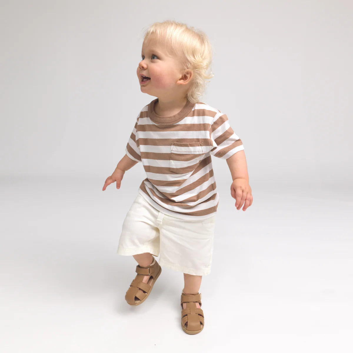 Theo features contrast detailing and heavy-weight stitching on the straps. An adjustable top strap, supportive padded heel, and closed toe make this podiatrist-approved summer sandal perfect for protecting growing feet.