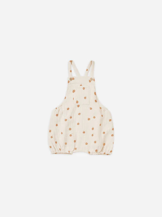 Woven overall romper featuring buttons on the straps, open bib pocket, and elastic leg openings.