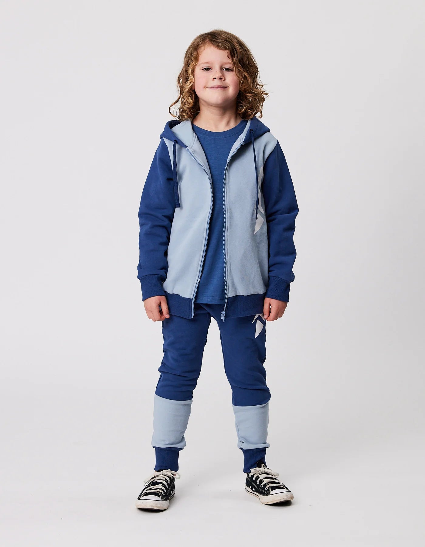 Brushed cotton / spandex basic pant in dark blue with placement ‘RAD’ print in white on left leg & pale blue ankle inserts. Patch pocket & signature bolt logo in white on reverse. Wear with the RAD Zip Hood for top-to-toe RADness.