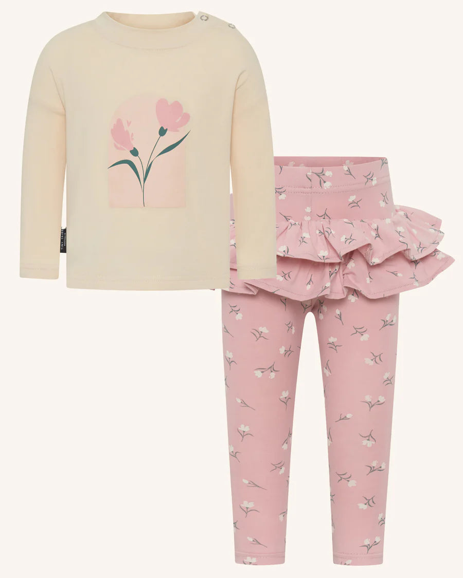 Our Sweet Flowers Set features our classic long sleeve tee and frill legging. Our tee features a floral graphic centre front and our legging features a matching floral print all over with frill detailing. Crafted from Cotton Elastane, the composition provides comfort and durability. Finished neck, sleeve and hem detail. Designed in Australia.