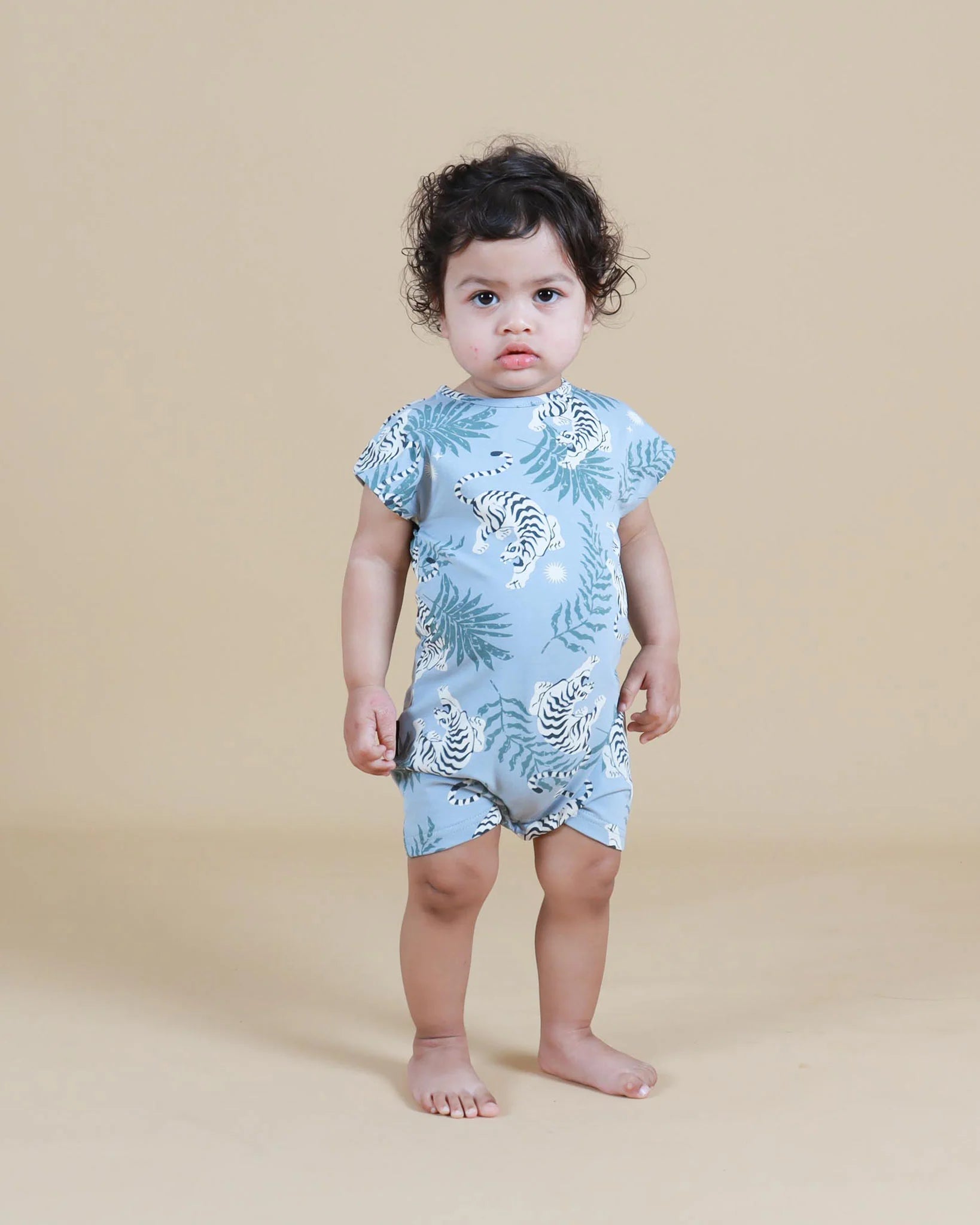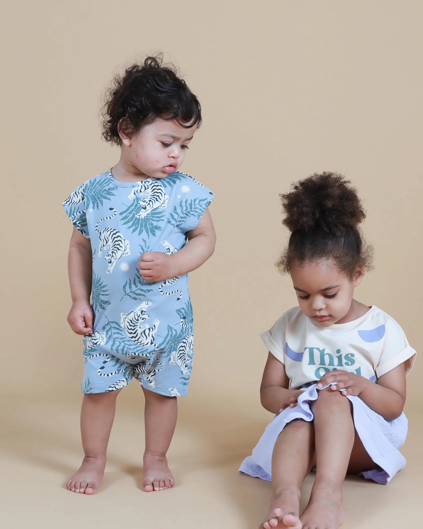 Our relaxed sleevless playsuit with snap back opening features a Tiger Jungle print all over. Crafted from Cotton Elastane, the composition provides comfort, stretch and durability. Finished neck, sleeve and hem detail. Cuffed leg and hem detail. Designed in Australia