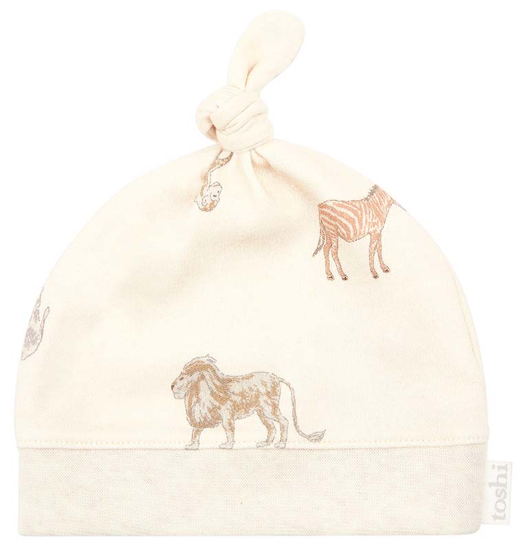 100% Organic Cotton Beanie in Cream with Animal Print and features a knot at top. Teams with Onesie Zipsuit