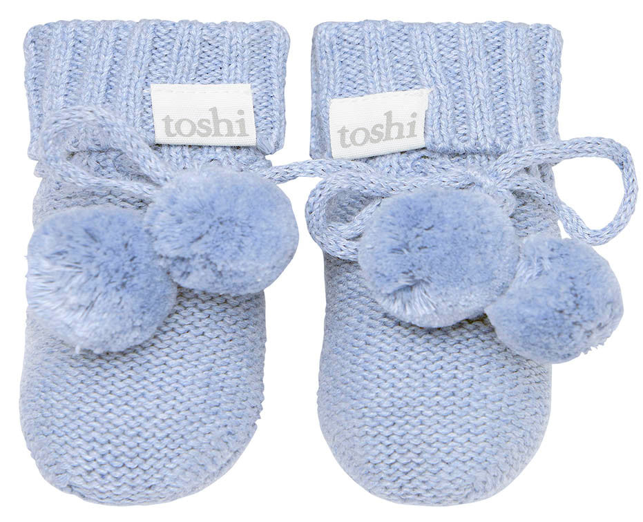 The much loved Toshi Organic Baby Booties Marley are made from the finest quality certified 100% organic cotton yarn. Organic certification ensures the booties are gentle on your babies delicate feet, as well as the environment. The beautifully-textured melange yarn brings an element of refinement to this Toshi baby accessory. Carefully crafted with a ribbed knit cuff, Toshi booties stay up while maintaining healthy circulation. Our booties are ankle height and are designed to protect precious tootsies during rest and play. Cute pom poms create a whimsical style and the ties ensure a snug fit. The colour of this pair of booties is Feather, a natural and earthy gender-neutral hue. Toshi booties are packaged in a quality box and make an ideal newborn gift.